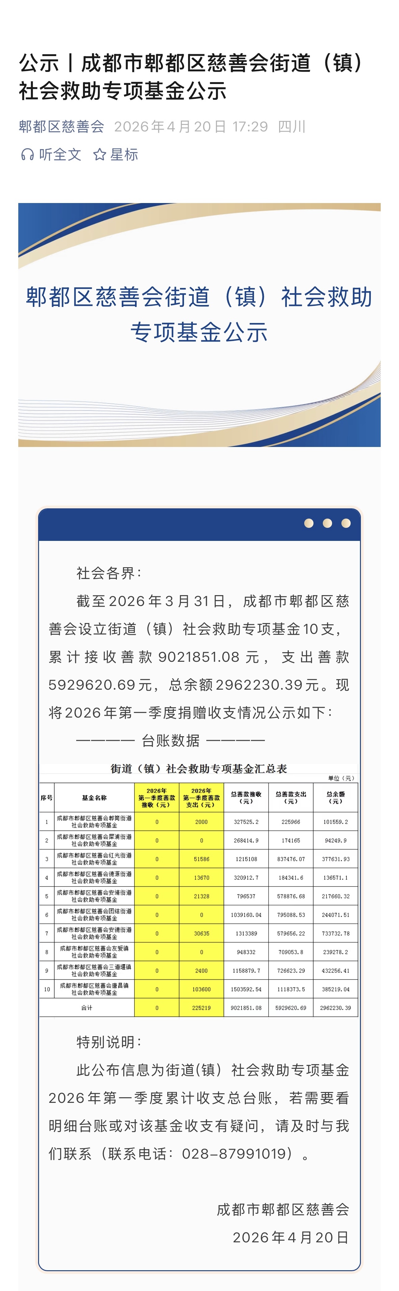 公示丨成都市郫都区慈善会街道(镇)社会救助专项基金公示