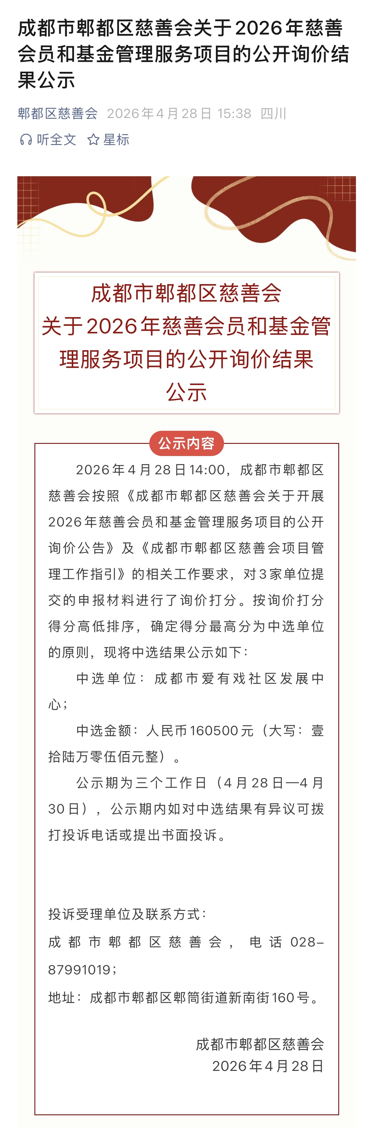 成都市郫都区慈善会关于2026年慈善会员和基金管理服务项目的公开询价结果公示